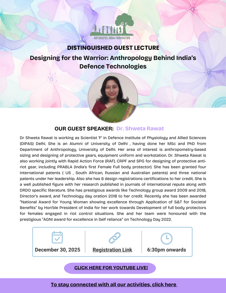 This report summarizes a Distinguished Guest Lecture delivered by Dr. Shweta Rawat on the role of anthropometry and ergonomics in India’s defence technology design. The lecture was organised by the Anthropos India Foundation as part of its Monthly Distinguished Guest Lecture Series. It was attended by approximately 50 participants via Google Meet and 40 participants through YouTube Live, with attendees joining from different parts of India. The session highlighted how human-centred anthropological research contributes directly to soldier safety, operational efficiency, and overall effectiveness in defence technology design.